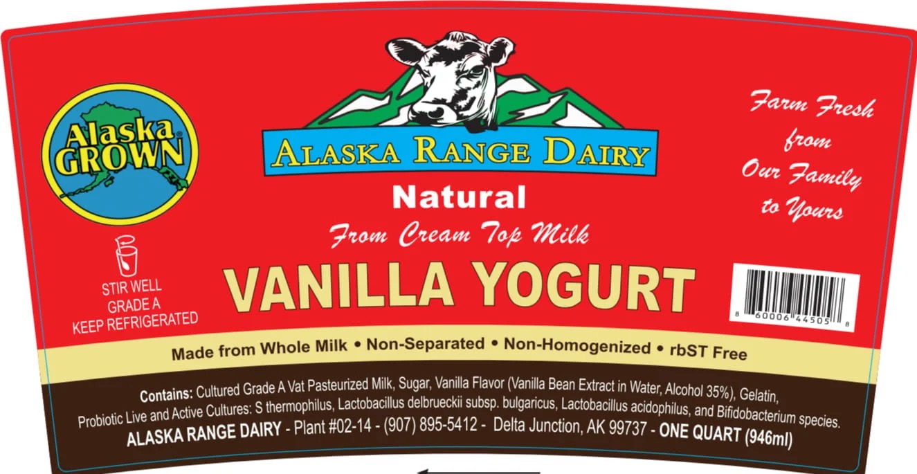 Savor the smooth, creamy flavor of Alaska Range Dairy Vanilla Yogurt. Made with Grade A milk and live active cultures, this 32 oz tub is perfect for breakfast, snacks, or blending into your favorite recipes.