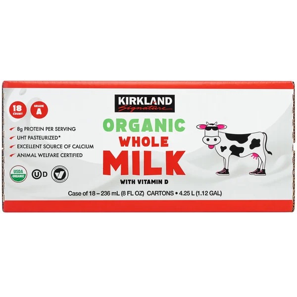 Enjoy the wholesome goodness of Kirkland Signature Organic Whole Milk. Each 8 fl oz carton is filled with Grade A, USDA Organic milk, UHT pasteurized for long shelf life and packed with 8g of protein and an excellent source of calcium. Fortified with Vitamin D, this milk is Kosher and Animal Welfare Certified. Perfect for on-the-go or at-home use, this pack includes 18 convenient, single-serve cartons.