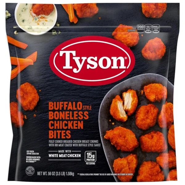 Turn up the heat with Tyson Boneless Chicken Bites, Buffalo Style. These tender, all-white meat chicken bites are fully cooked and coated in a zesty Buffalo sauce for bold, spicy flavor in every bite. With 3.5 lbs per bag, they’re perfect for parties, snacks, or quick meals. Just heat and enjoy that crave-worthy Buffalo kick — no fryer needed!