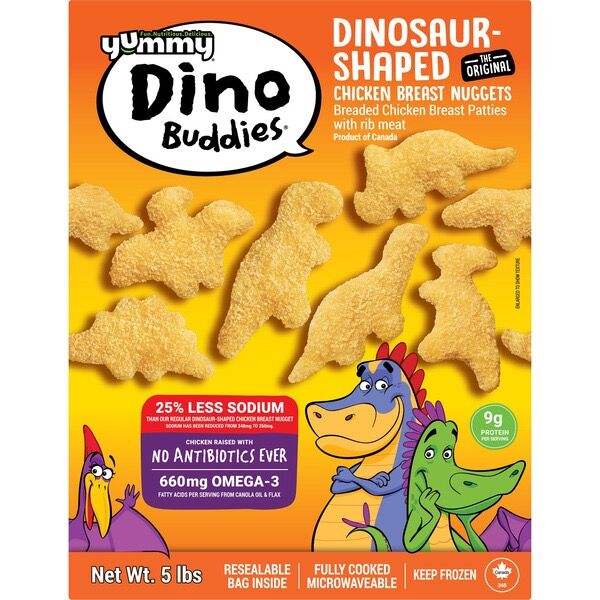 Make mealtime fun and nutritious with Yummy Dino Buddies Dinosaur-Shaped Chicken Breast Nuggets. Made with 100% all-natural white meat chicken breast, these playful dino-shaped nuggets are a favorite among kids and parents alike. With no antibiotics ever, no artificial ingredients, and a 5 lb value pack, they’re perfect for quick lunches, dinners, or snacks.