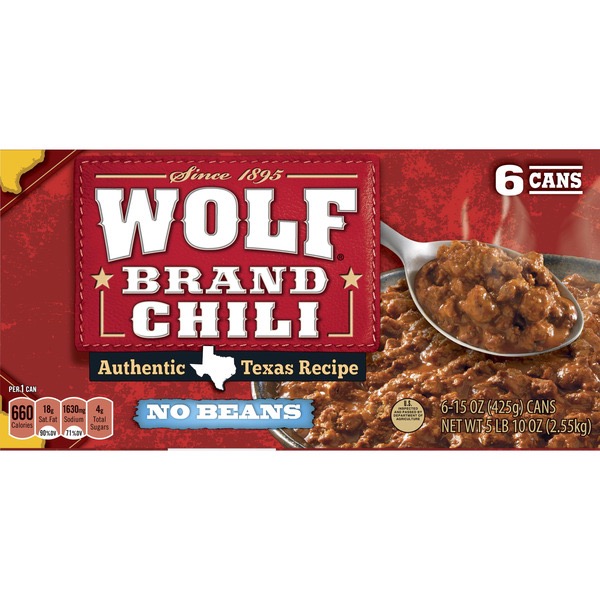 Satisfy your craving for bold Texas flavor with Wolf Brand Chili, No Beans. Made with a hearty blend of beef, pork, and savory spices, this minimally processed chili contains no artificial ingredients or preservatives. Perfect for quick meals, topping hot dogs, or adding a kick to nachos, each 15 oz can is ready to heat and serve. This 6-pack is ideal for families, meal prep, or stocking the pantry.